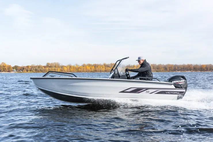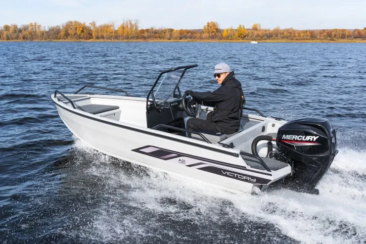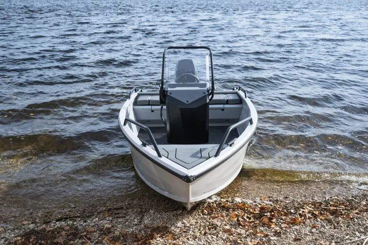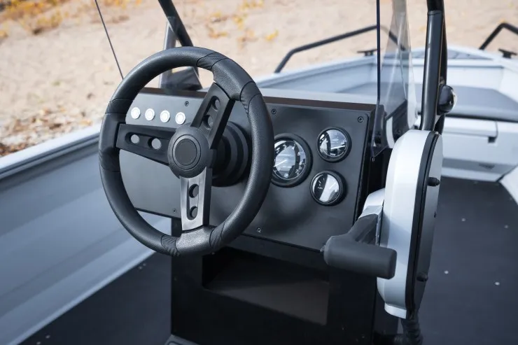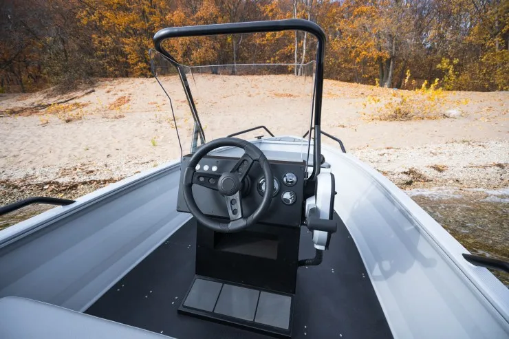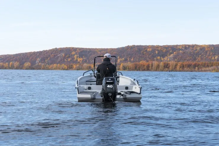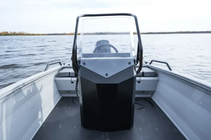 Данной модели лодки достаточно двигателя в 20 л.с. для передвижения как по открытой воде, так и по узким протокам/речкам. Эксплуатация возможна как с консолью так и без, под румпельный мотор.