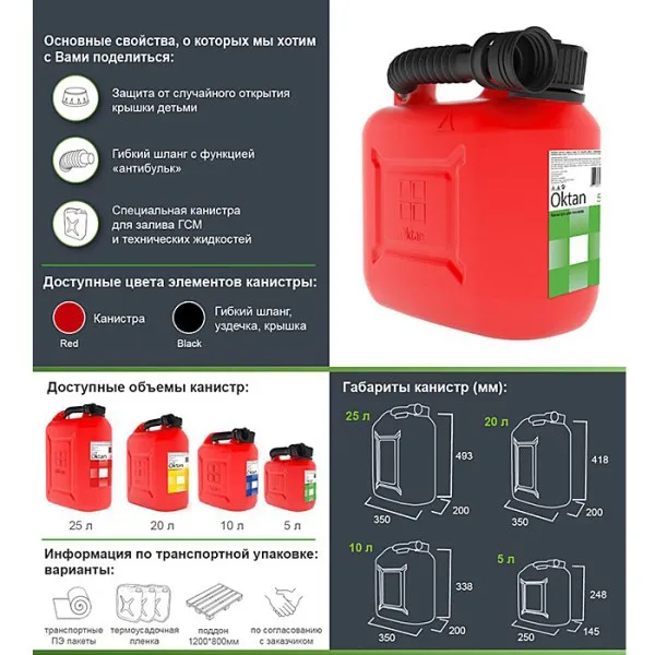 Эргономичная легкая канистра с высокотехнологичной фурнитурой, удобна при эксплуатации, имеет замок от детей. Снабжена гибким носиком с технологией «Антибульк». Предназначена для транспортировки топлива и гсм.